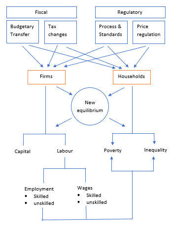 The conceptual framework differentiates four generic types of fiscal and regulatory policy: budgetary transfers, tax changes, process and standards, and price regulations. Impacts on inequality and poverty are then considered through the lens of how each type of policy may affect households and firms, both directly and indirectly, through changes to employment and wages and changes in consumption and commodity prices. The framework also questions the spatial impacts of policies, as well as their effects over time.